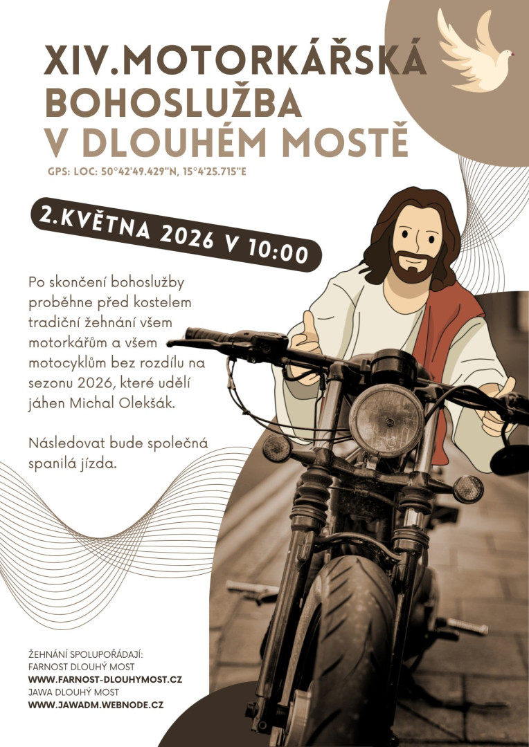 Po skončení bohoslužby proběhne před kostelem tradiční žehnání všem motorkářům a všem motocyklům bez rozdílu na sezonu 2026, které udělí jáhen Michal Oleksák. Následovat bude společná spanilá jízda.