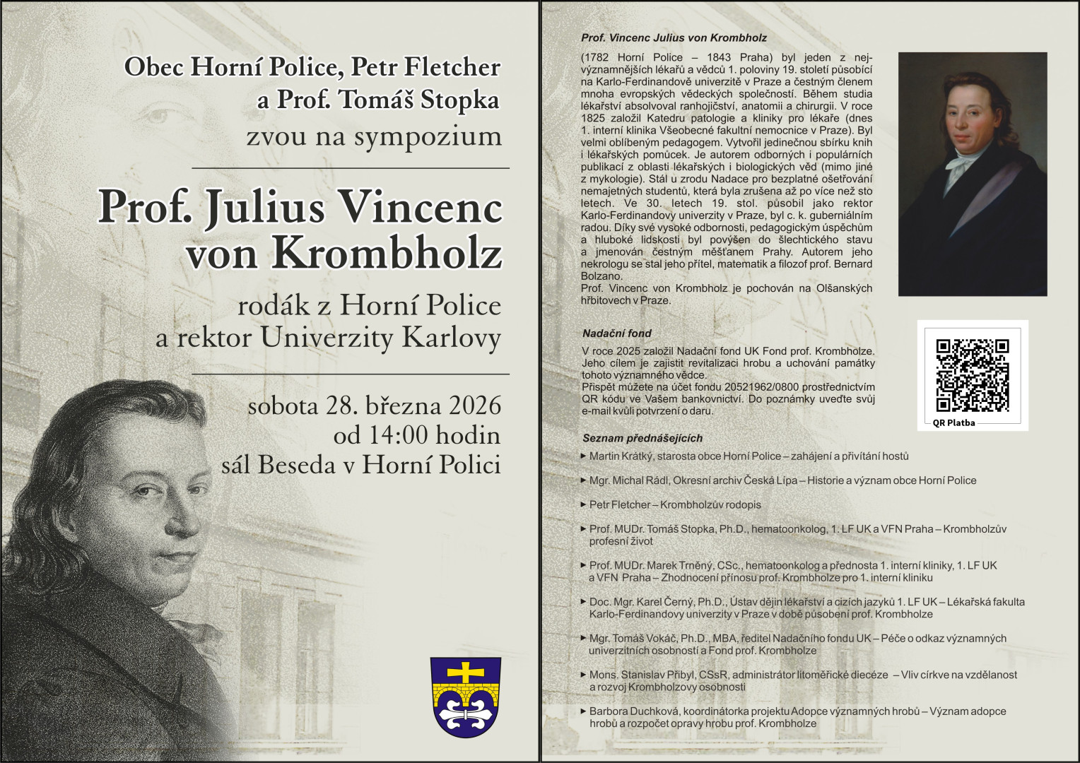 Obec Horní Police, Petr Fletcher a prof. Tomáš Stopka zvou na sympozium Prof. Julius Vincenc von Krombholc, rodák z Horní Police a rektor Univerzity Karlovy