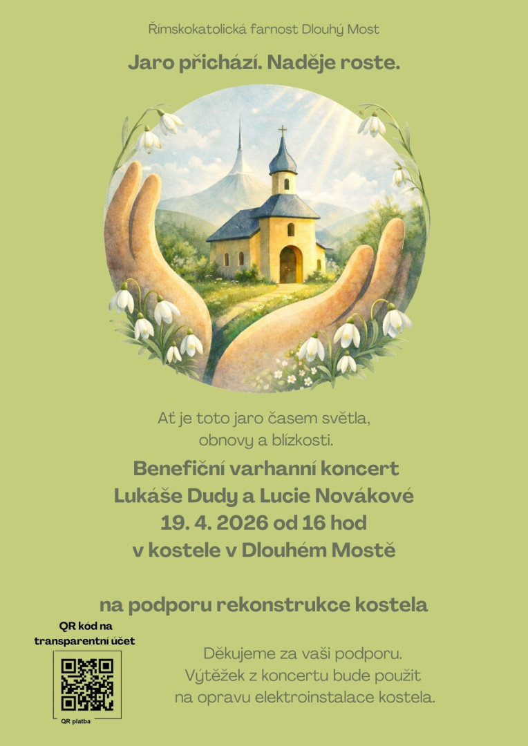 ŘKF Dlouhý Most srdečně zve na benefiční varhanní koncert Lukáše Dudy a Lucie Novákové, jehož výtěžek bude využit na opravu elektroinstalace kostela. Je možné přispět i prostřednictvím QR kódu na plakátku.