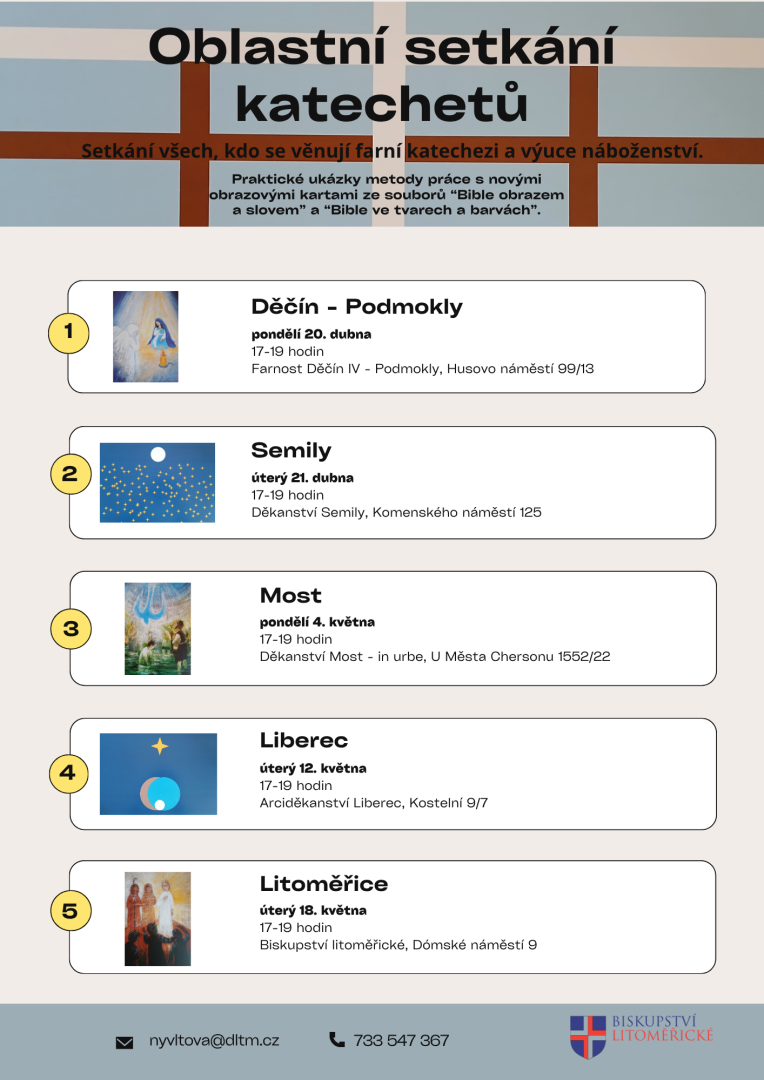 Katechetické centrum Biskupství litoměřického srdečně zve každého, kdo se věnuje výuce náboženství nebo jakékoli formě farní katecheze na oblastní setkání, které nabídne prostor ke sdílení zkušeností, inspiraci i vzájemnému povzbuzení.
