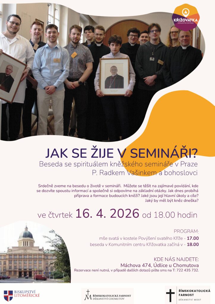 Komunitní centrum Křižovatka Údlice srdečně zve na besedu o životě v kněžském semináři v Praze. Můžete se těšit na zajímavé povídání, kde se dozvíte spoustu informací a společně si odpovíme na základní otázky.