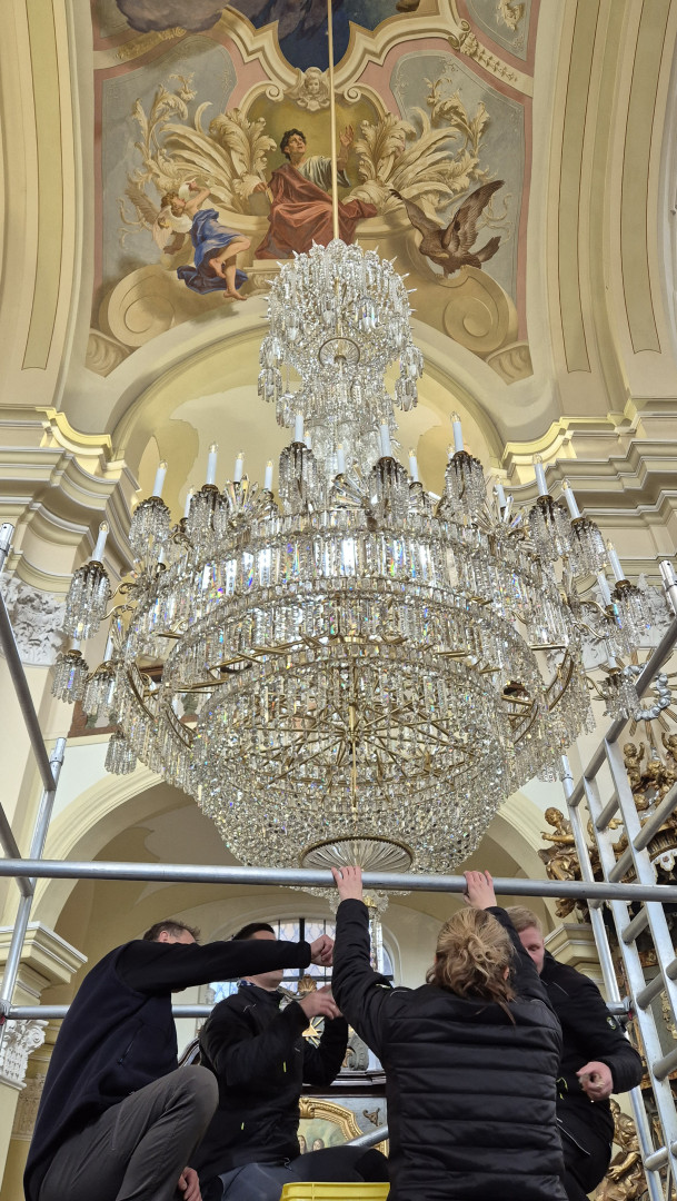 Podle plánu chtěli ve farnosti lustr rozsvítit už na slavnost Zmrtvýchvstání Páně, ale čáru přes rozpočet udělala skrytá závada, kterou se podařilo odstranit a nyní jej bezpečně zavěsit.