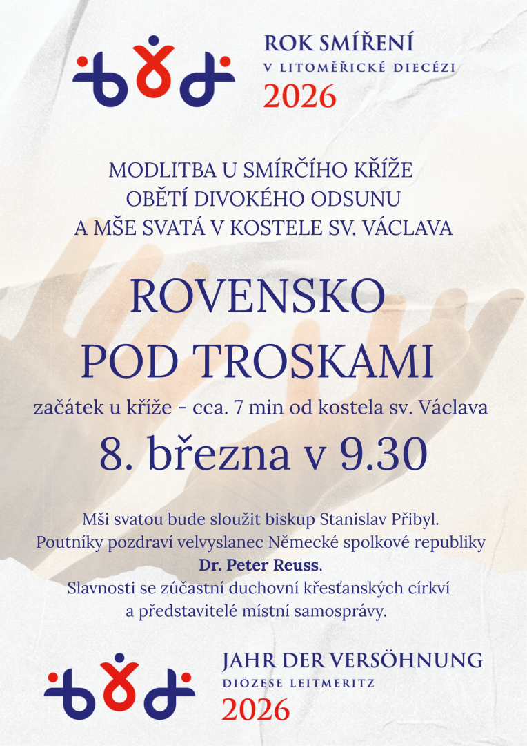 Další z událostí Roku smíření v litoměřické diecézi se zúčastní velvyslanec Německa Peter Reuss. Bohoslužba a modlitba u Smírčího kříže obětí divokého odsunu německy mluvícího obyvatelstva po druhé světové válce se uskuteční 8. března v Rovensku pod Troskami.
