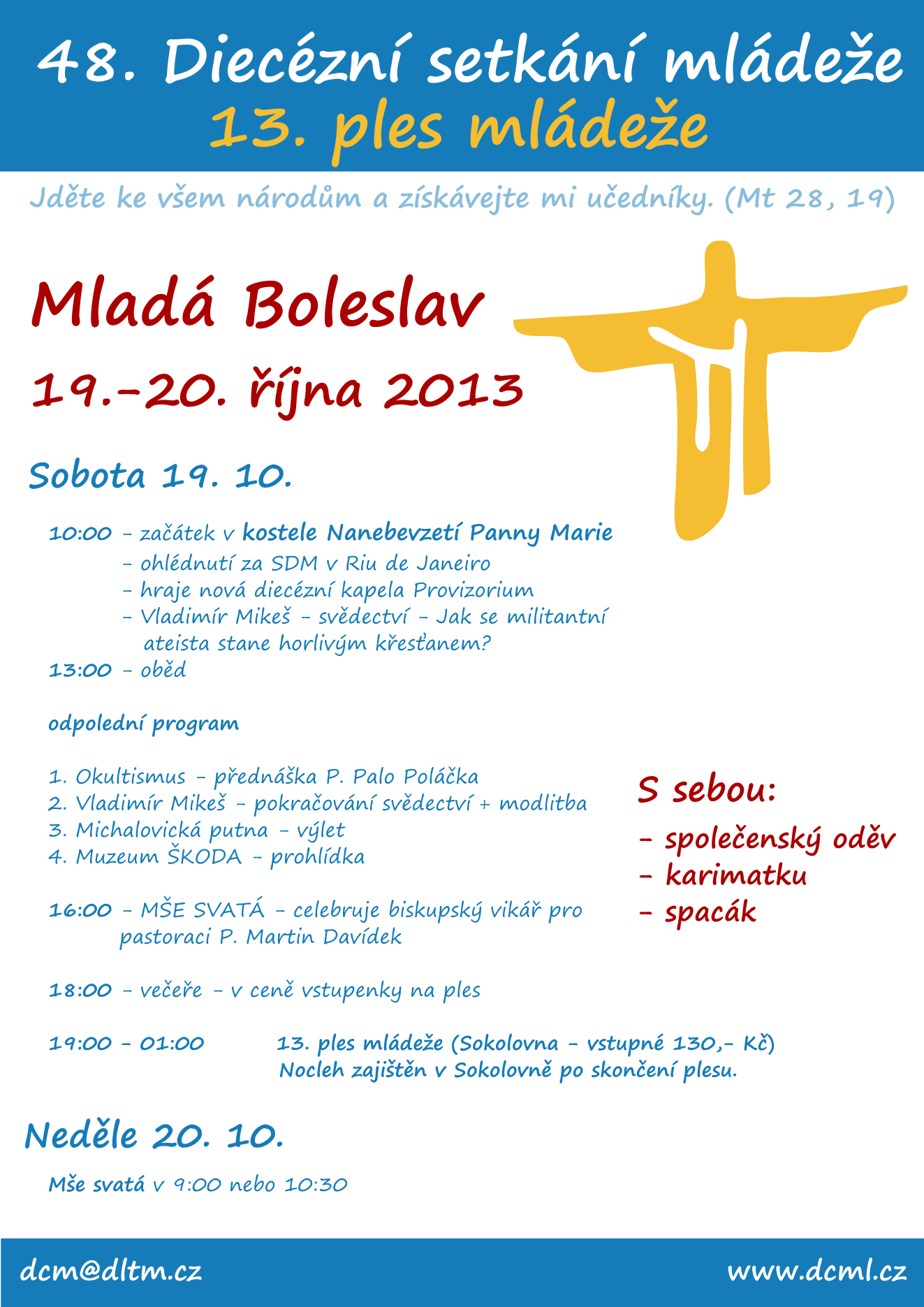 Diecézní centrum pro mládež srdečně zve na 48. diecézní setkání mládeže a 13. reprezentační ples. Probíhat bude v Mladé Boleslavi v termínu 19. – 20. října 2013.