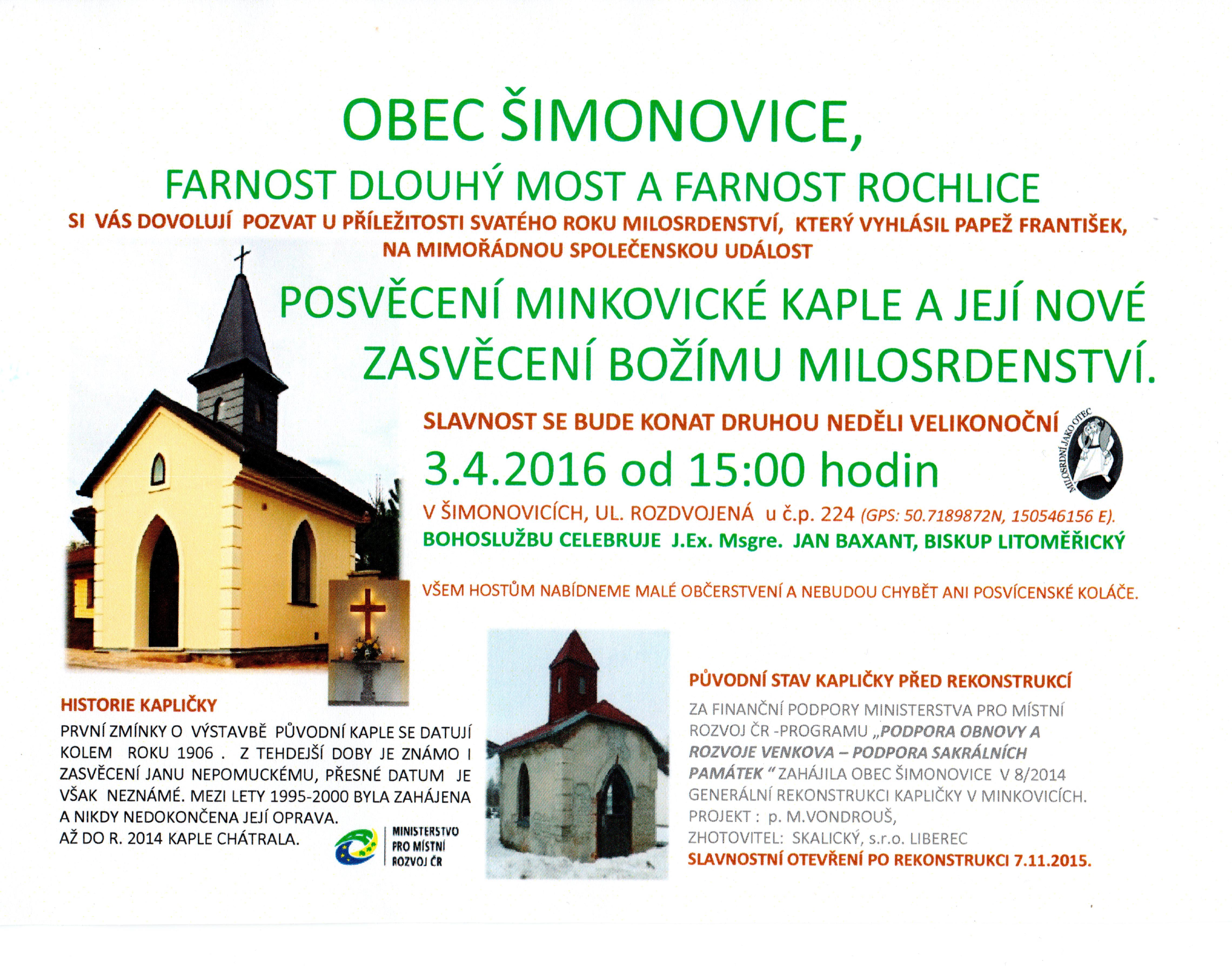 Litoměřický biskup Mons. Jan Baxant navštíví v neděli 3. dubna 2016 Minkovice (Šimonovice) na Liberecku, aby tamní opravenou kapli nově zasvětil Božímu milosrdenství. Slavnost začíná v 15 hodin.