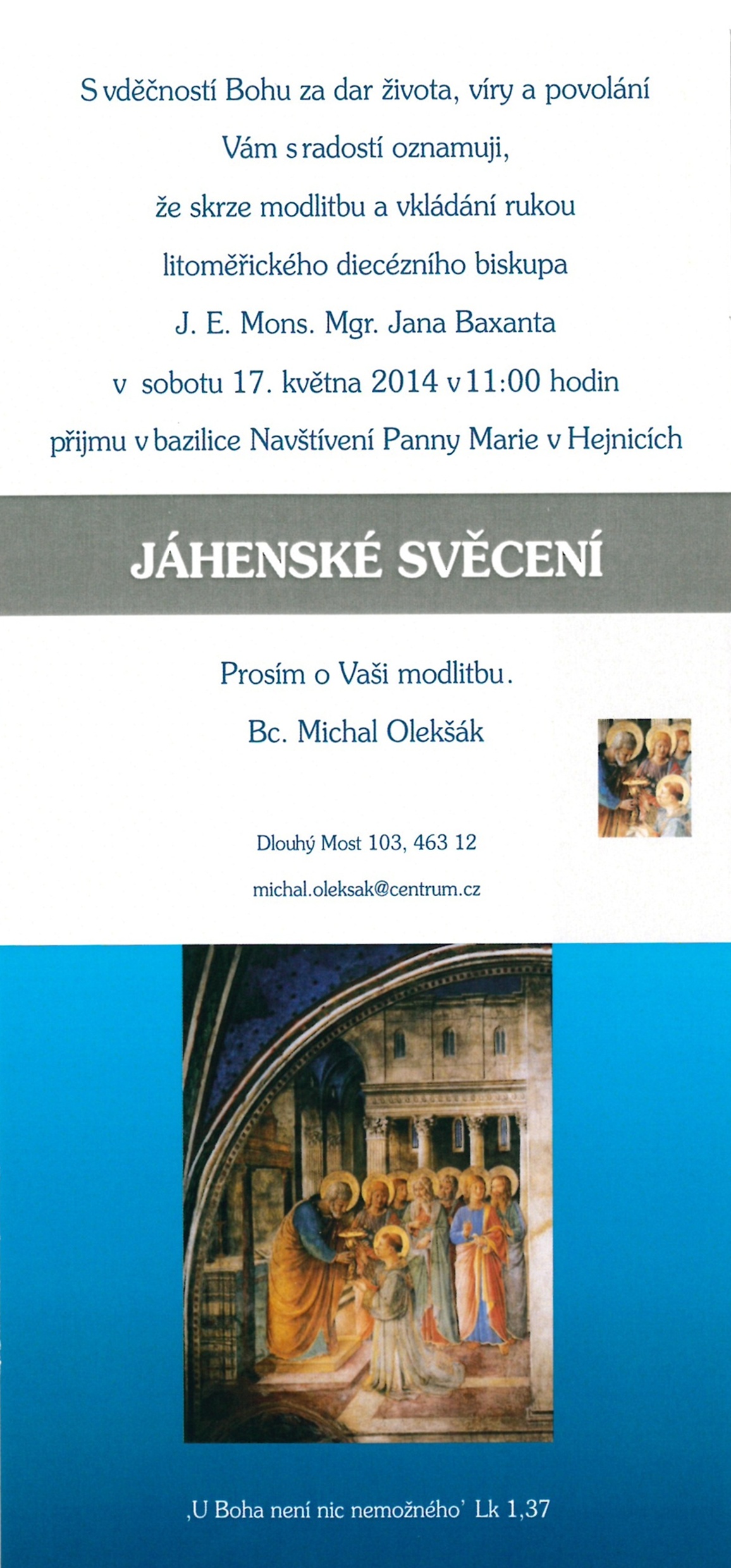 Skrze modlitbu a vzkládání rukou diecézního biskupa Mons. Jana Baxanta přijme jáhenské svěcení Bc. Michal Olekšák, administrátor in materialibus farností Dlouhý Most, Křižany, Rynoltice a Žibřidice. Slavnost se koná v sobotu 17. května 2014 od 11.00 hodin v bazilice Navštívení Panny Marie v Hejnicích.