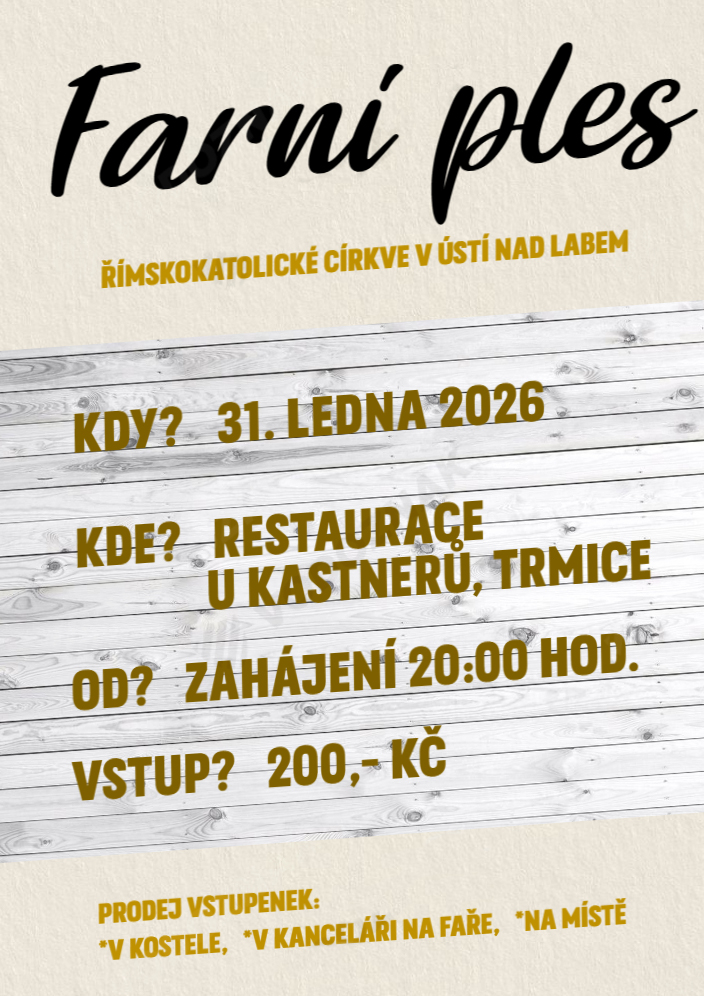 Farní ples Římskokatolické církve v Ústí nad Labem se koná v sobotu 31. ledna 2026 od 20 hodin v restauraci U Kastnerů v Trmicích. Vstupné 200 Kč. Vstupenky k zakoupenní v kostele, v kanceláři na faře a na místě konání.