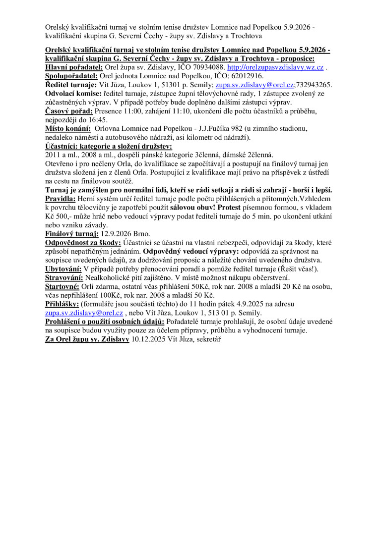 5.9.2026 11h. Lomnice nad Popelkou stolní tenis družstva kvalifikace + otevřený turnaj orlovna 2011 a ml., 2008 a ml., dospělí pánské kategorie 3členná, dámské 2členná. Přihlášky do 11 hodin pátek 4.9.2025 na zupa.sv.zdislavy@orel.cz, případně Vít Jůza, Loukov 1, 51301 p. Semily, tel. 732943265. Proposice s formulářem přihlášky na http://orelzupasvzdislavy.wz.cz. (finálový turnaj Brno 12.9.2026)