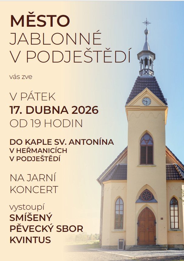 Město Jablonné v Podještědí zve do heřmanické kapličky sv. Antonína v pátek 17. dubna od 19:00 h. Úplně poprvé zde vystoupí pěvecký sbor Kvintus z Liberce. Přijďte se naladit na jaro, těšíme se na viděnou!