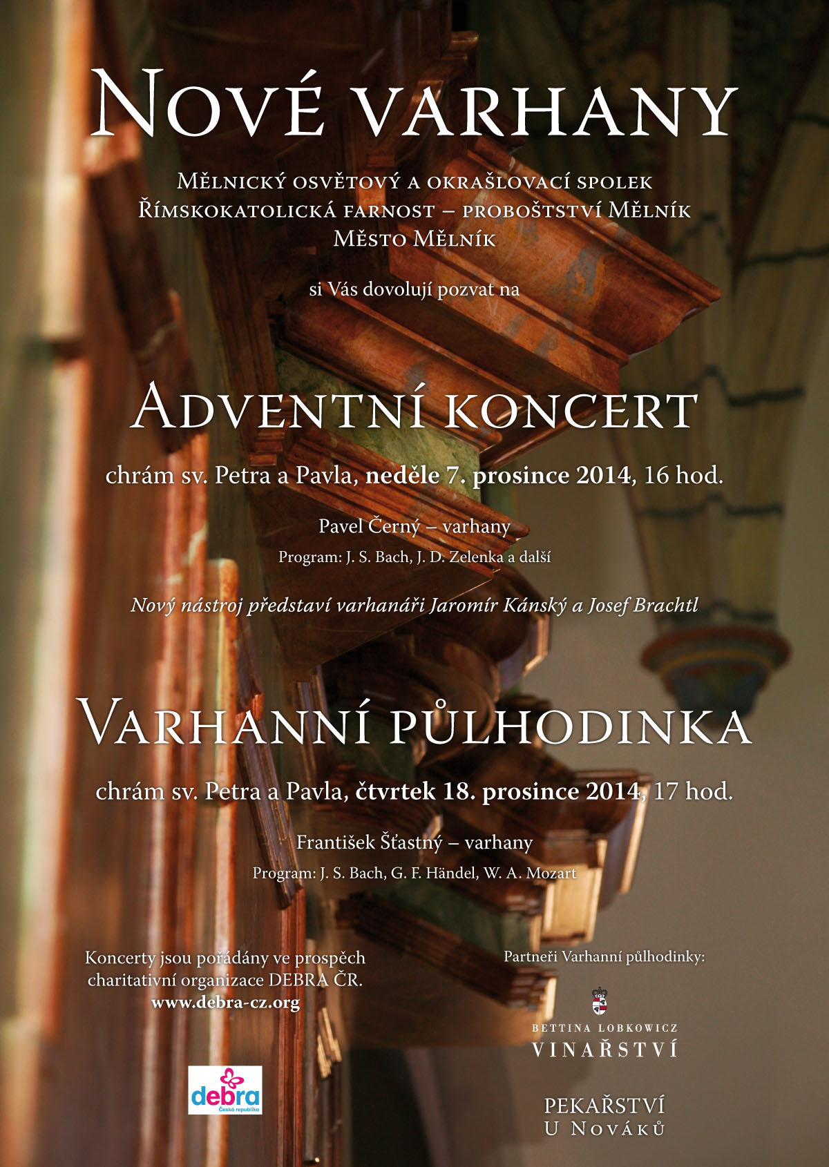 Přijďte tedy, prosím, v neděli 7. prosince 2014 do chrámu sv. Petra a Pavla, kde v 16 hodin budete moci nahlédnout do tajů královského nástroje, nacházet zklidnění pro dobu adventní a zároveň podpořit formou dobrovolného vstupného či nákupem předmětů sdružení DEBRA ČR. Z nich upozorníme zvláště na kalendář 12 plus 12 na rok 2015, kde 12 osobností ztvárňuje motýla dle 12 výjimečných umělců na fotografiích Lucie Robinson. Tou úvodní osobností je patronka organizace, mělnická rodačka Jitka Čvančarová.