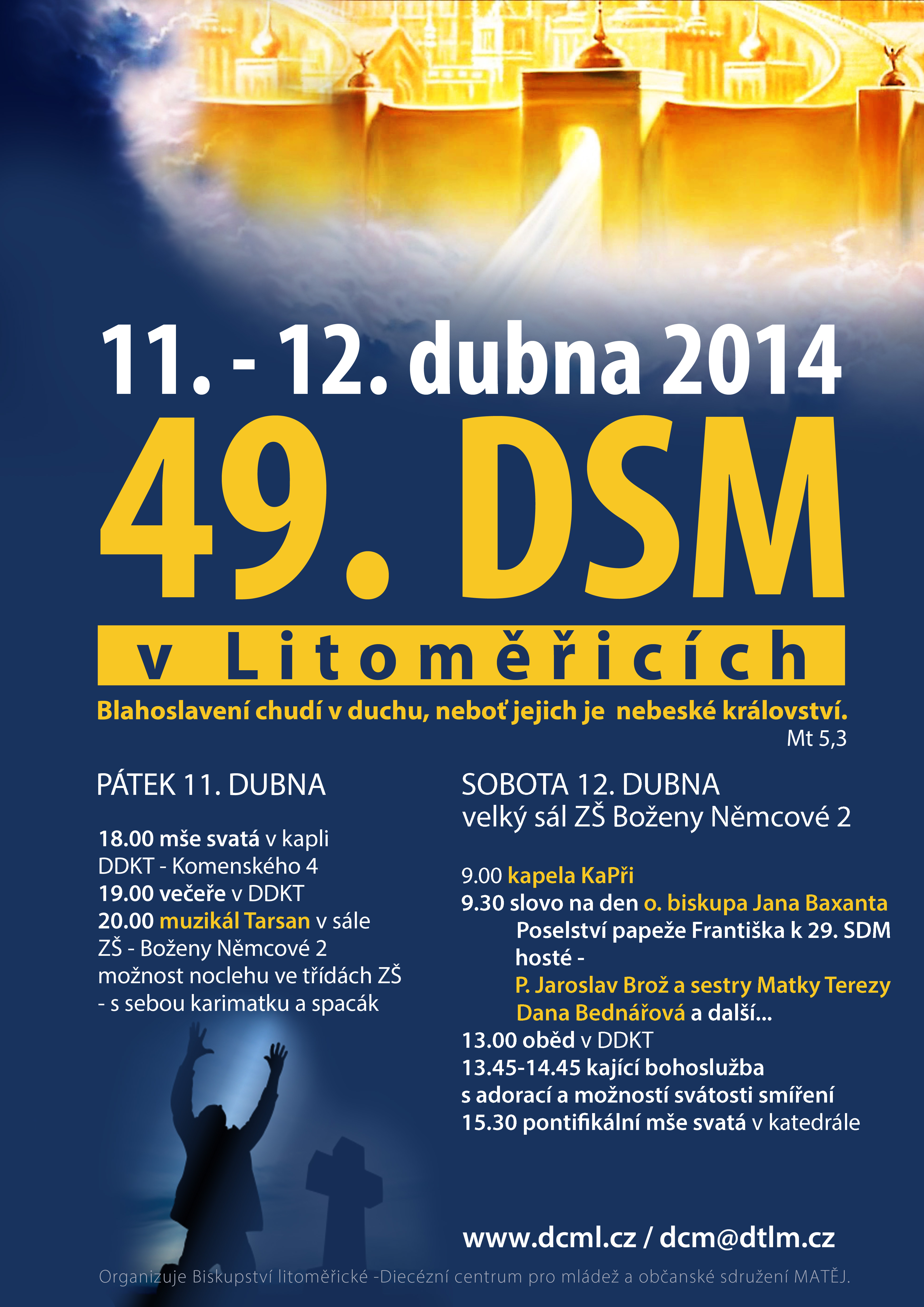 Diecézní centrum pro mládež zve na 49. diecézní setkání mládeže, které se bude konat v Litoměřicích ve dnech 11. - 12. dubna 2014. Jeho mottem jsou slova z Písma „Blahoslavení chudí v duchu, neboť jejich je nebeské království.“ (Mt 5,3).