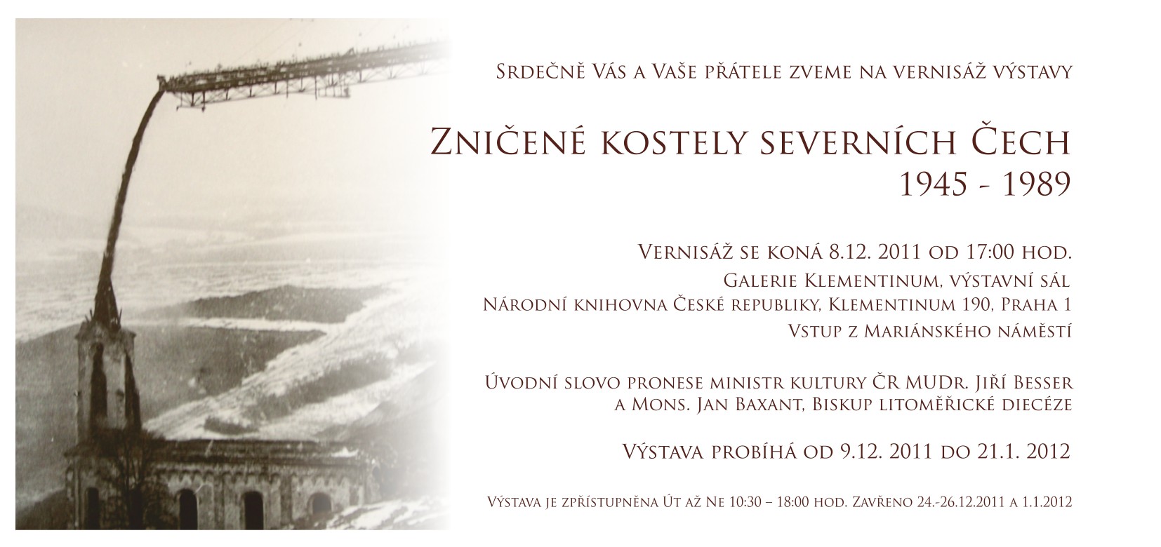Ve čtvrtek 8. prosince 2011 od 17 hodin se v pražském Klementinu uskuteční vernisáž výstavy Zničené kostely severních Čech 1945–1989. Úvodní slovo při otevření výstavy pronese litoměřický biskup Jan Baxant a ministr kultury ČR Jiří Besser.