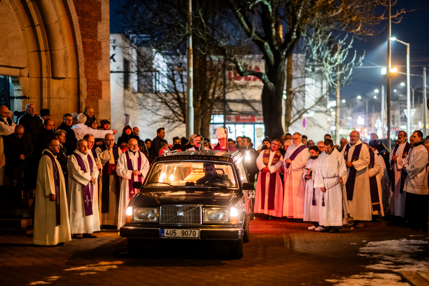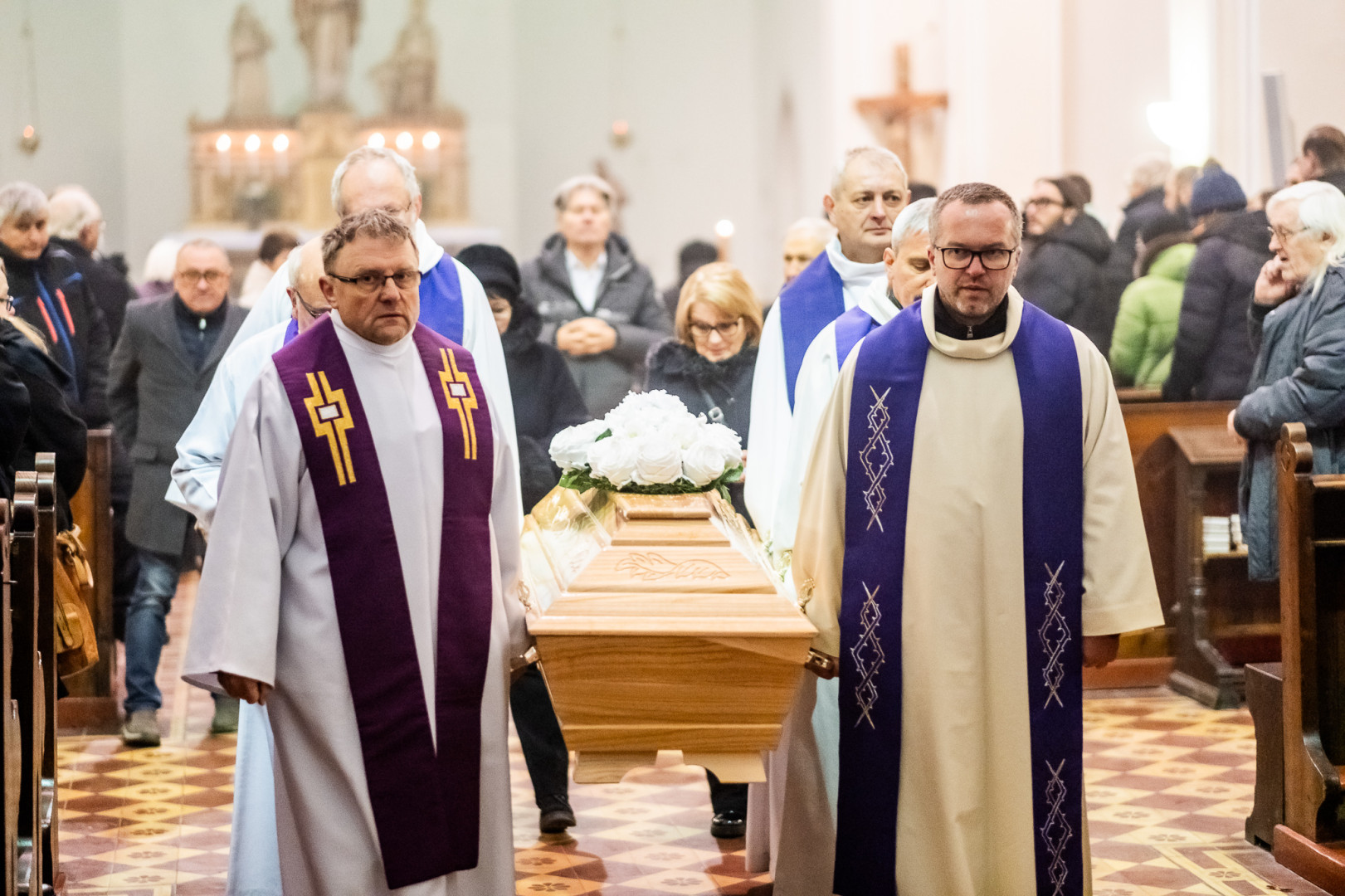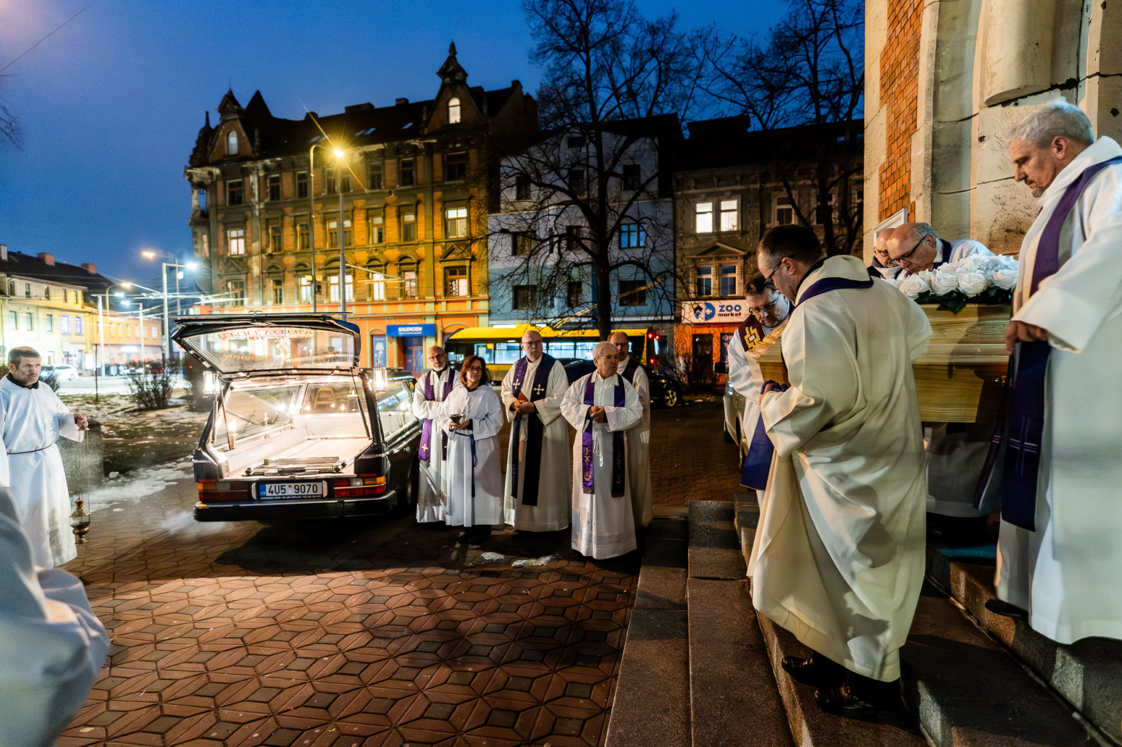 Po obřadech posledního rozloučení vynesli rakev Vojtěcha Glogara spolubratři z teplické komunity z kostela, aby mohla být převezena k pohřbu do Zlína.
