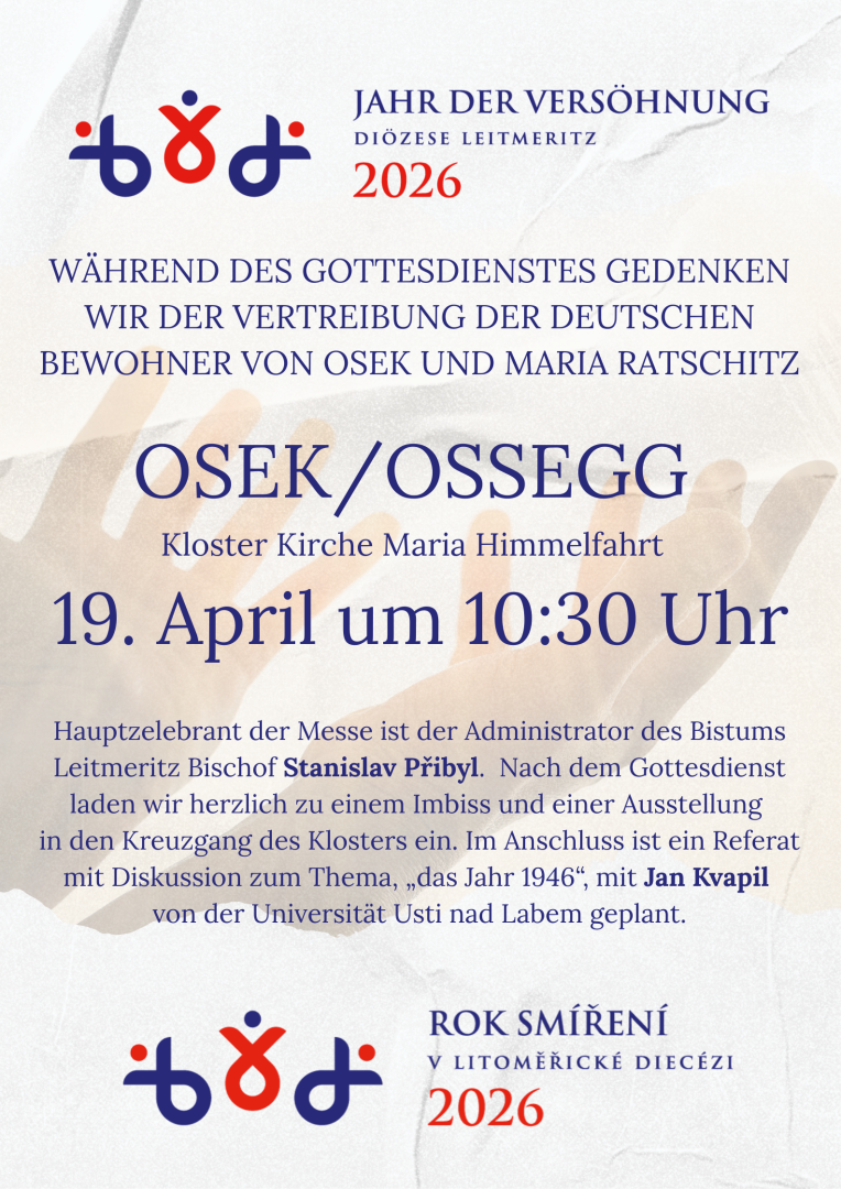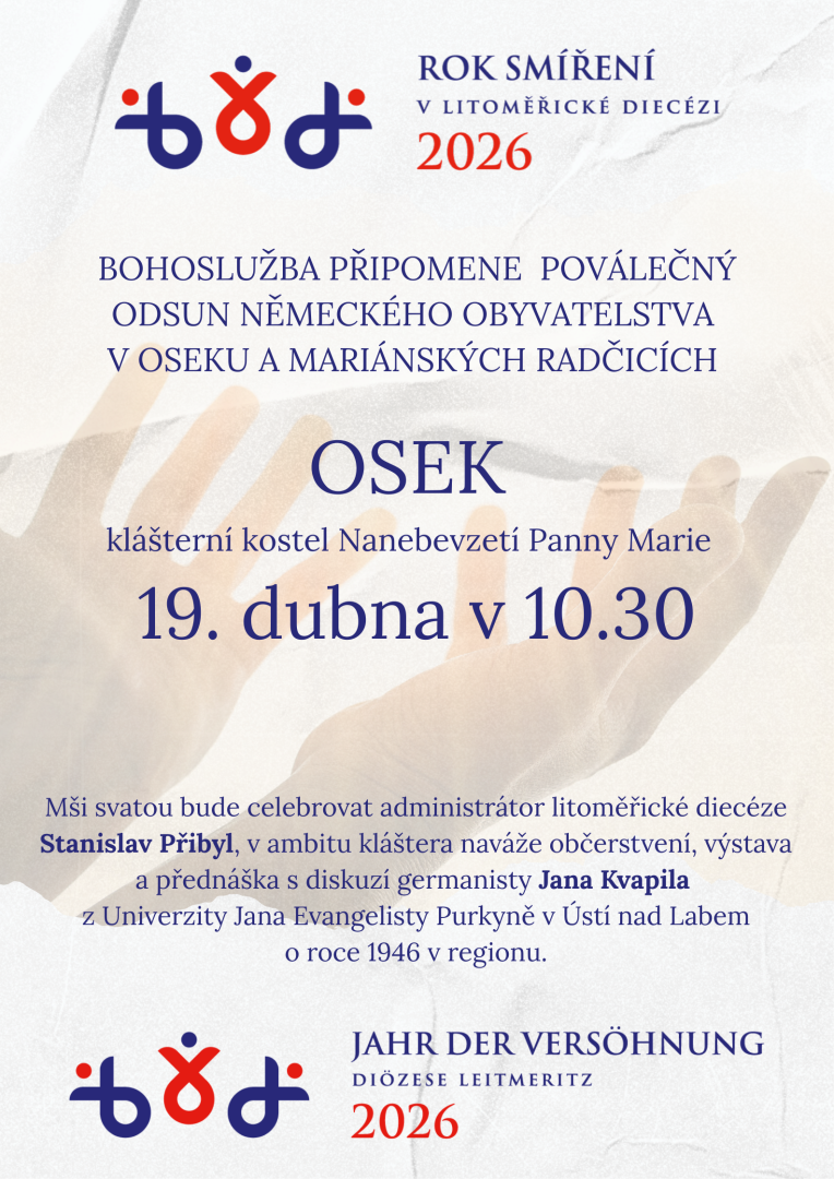 Dubnovou bohoslužbu Roku smíření bude hostit cisterciácký klášter v Oseku v neděli 19. dubna. Do klášterního kostela zve k modlitbě a vytrvalému hledání smíření administrátor litoměřické diecéze, biskup Stanislav Přibyl. Bude už čtvrtá v pořadí.
